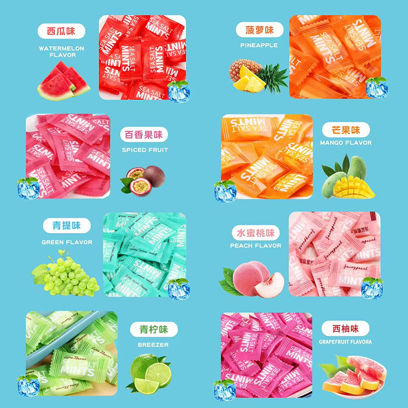 మా క్యాండీ కుటుంబానికి కొత్తగా జోడించినది - రిఫ్రెషింగ్ మరియు రుచికరమైన చక్కెర లేని సముద్ర ఉప్పు పుదీనా చిప్స్! ఈ పుదీనా-రుచిగల క్యాండీలు సాంప్రదాయ క్యాండీల యొక్క జిడ్డు లేకుండా తీపి మరియు ఉల్లాసాన్నిచ్చే పరిపూర్ణ కలయిక. ఈ టాబ్లెట్లు ప్రత్యేకమైన సముద్ర ఉప్పు పుదీనా రుచిని కలిగి ఉంటాయి, ఇది మీ రుచి మొగ్గలను ఖచ్చితంగా ఆకట్టుకుంటుంది మరియు మిమ్మల్ని ఉత్సాహంగా ఉంచుతుంది.
